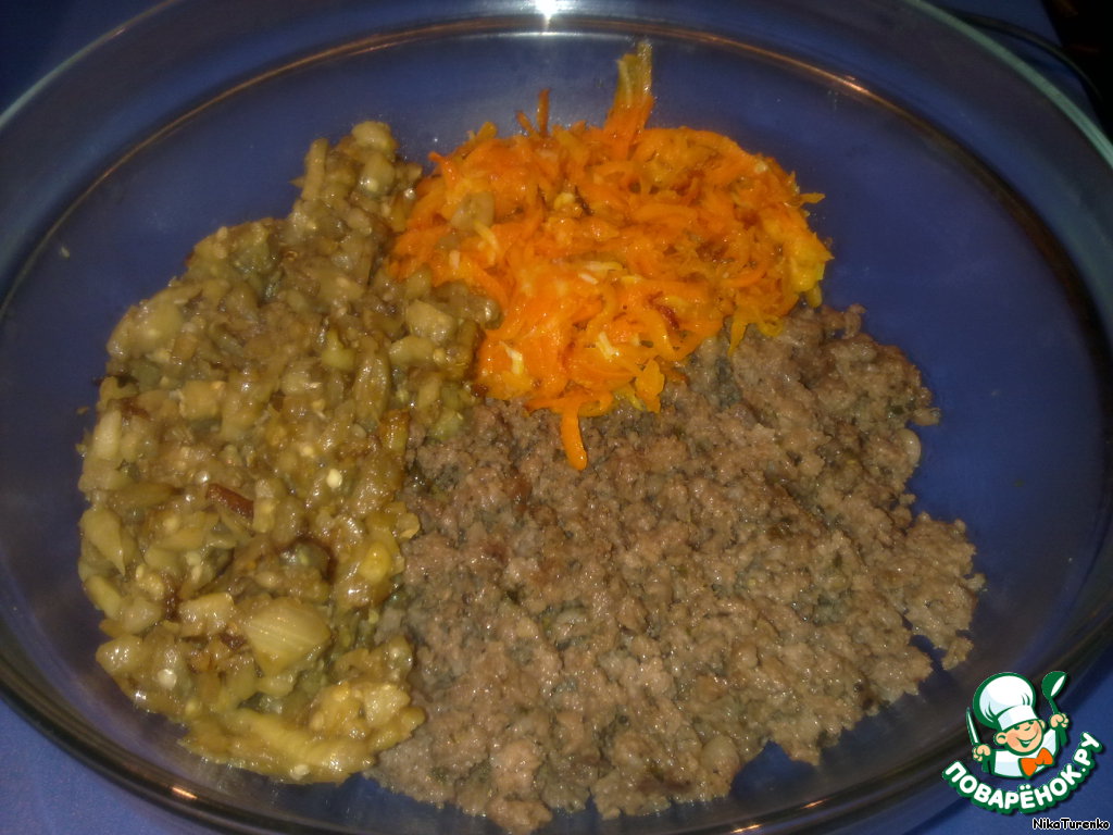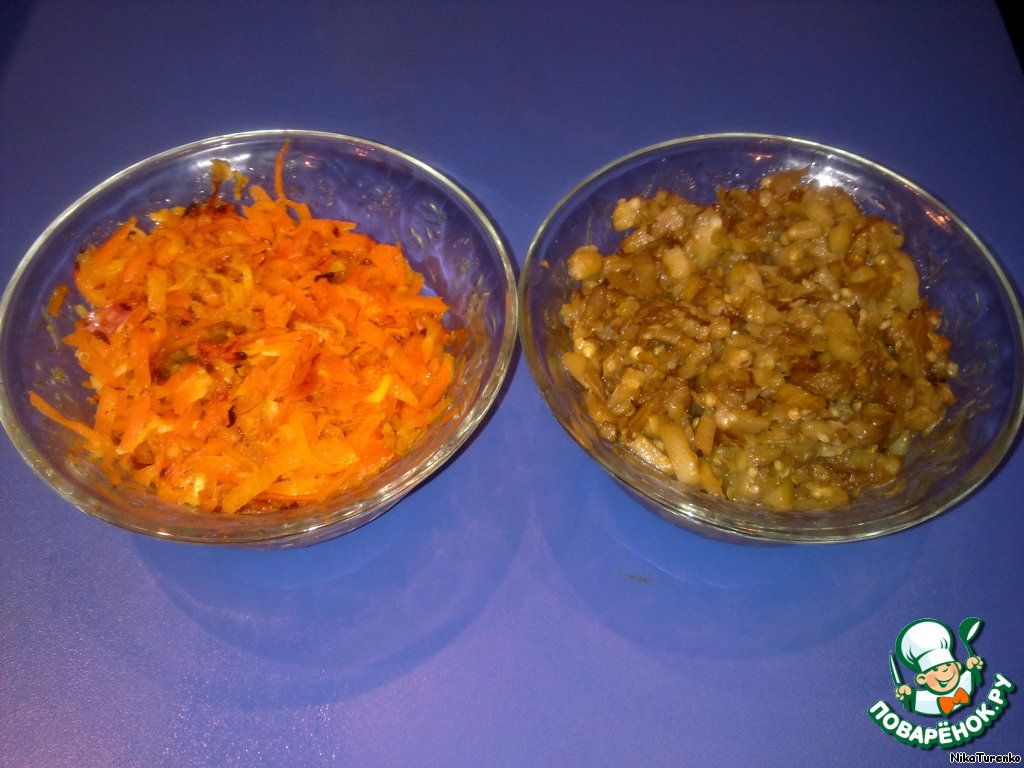 Режем лук, морковь трем на крупной терке, измельчаем мякоть баклажана. Жарим овощи на подсолнечном масле (морковь - лук - чеснок) (баклажаны)