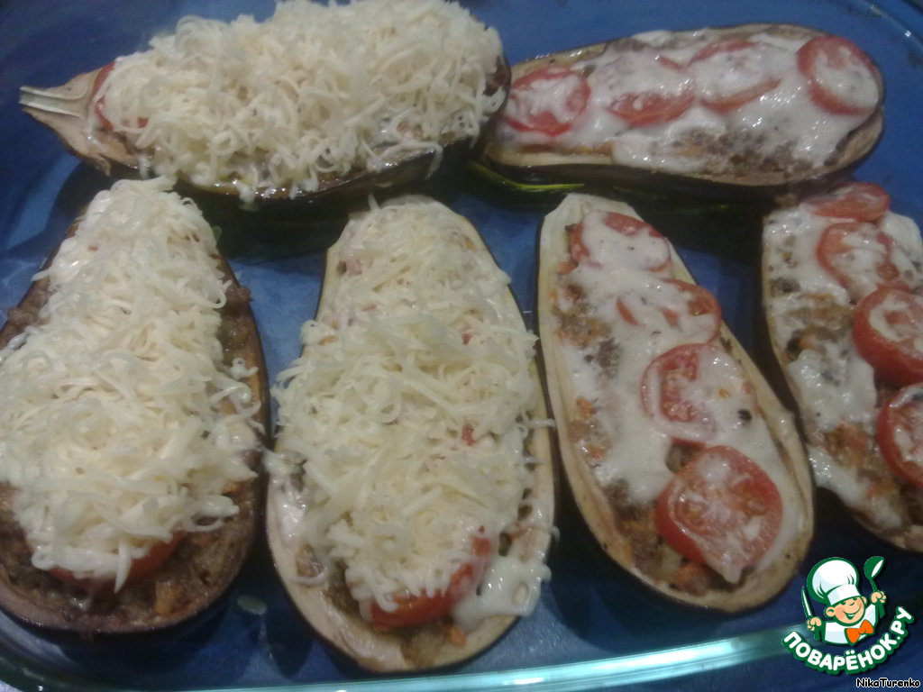 Достаем наши лодочки из духовки. Посыпаем тертым (на средней терке) сыром. Ставим в духовку до образования золотистой корочки.