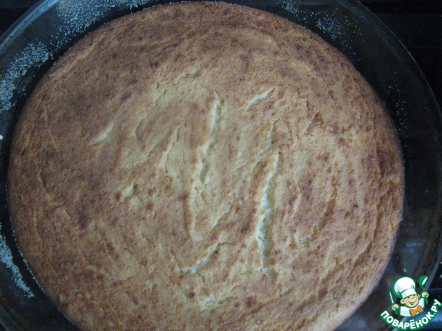 Обсыпать форму манкой, выложить подготовленную массу в форму и в духовку, минут на 30 -35, до румяной корочки.