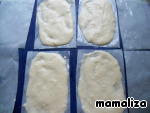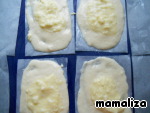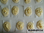 Выкладываем тесто на пергамент по 1 столовой ложке, разравниваем. Я готовила в 2 приема по 12 пирожков.