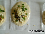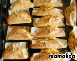 Теперь очень осторожно складываем пергамент пополам, оставляя начинку внутри теста. Выкладываем пирожки вместе с пергаментом в форму для запекания. Выпекаем 25-30 минут.