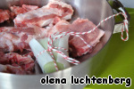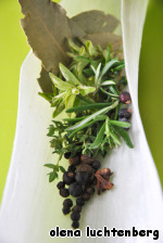 Здесь я отклонилась от рецепта и совсем не пожалела, вот мой набор: гвоздика, черный перец, лавровый лист, розмарин, майоран, тимьян, душистый перец, ягоды можжевельника, завернутые в чистый лист лука порея.