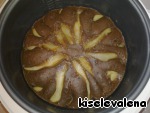 Кастрюлю мультиварки слегка смазать растительным маслом и чуть-чуть присыпать мукой. Выложить в нее получившееся тесто. Сверху разложить нарезанные дольками груши. Режим "Выпечка" 65 + 30-35 минут.
