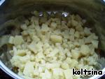 Так как у меня 2 одинаковые кастрюли, то пока в одной остывает бульон, я в другую начинаю нарезать кубиками очищенный от мундира картофель и...