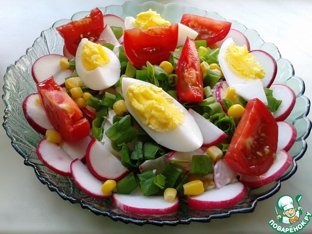 Нарезать тонкими ломтиками редис. Добавить кукурузу (жидкость слить). На помидоре сделать крестообразный надрез, ошпарить кипятком и снять кожицу. Нарезать не очень маленькими кусочками.
