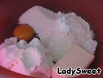 Смешиваем творог, масло, сахар, соду, муку, яйцо.