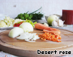 Нарезать овощи - скороваркие более крупными кусочками, а морковь и репу, например, помельче. Лук нарезать полукольцами. Лука по желанию можно брать больше. -