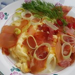 Яйца взбить как на омлет и вылить на сковороду с маслом. Обжарить яичный блин с двух сторон. Затем нарезать его как ветчину (тонкими полосками).