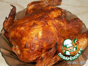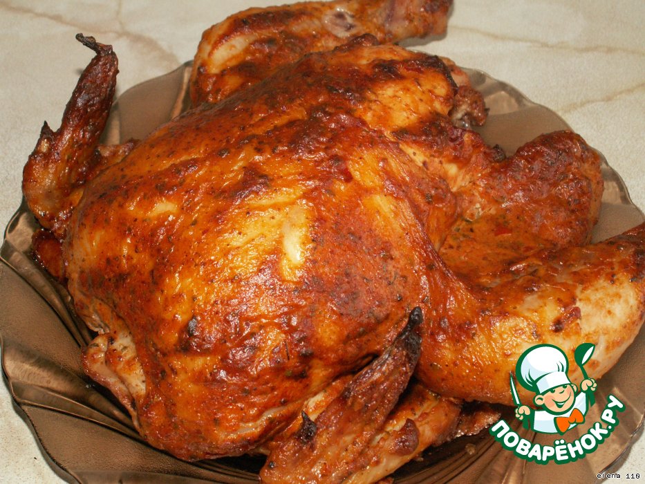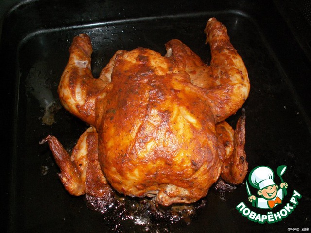 Поставить противень с курицей в разогретую до 180 градусов духовку и запекать 50 минут, потом огонь прибавить до 200 градусов и запекать ещe 25 минут. -