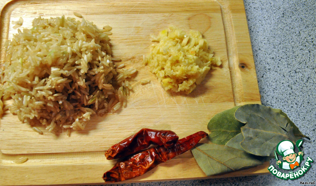 Рис промываем, чеснок трем, лавровый лист и перец готовы.