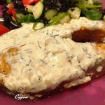 Подаем рыбу с соусом и гарниром по Вашему вкусу и желанию. У меня это салат из свежих овощей, заправленный этим же соусом.