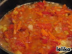 На сковороду налить 1 ст. л. растительного масла, выложить лук и морковь, слегка обжарить, добавить мякоть помидора, нарезанный перец, влить 1 половник бульона и готовить 5 минут.