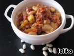 Очень вкусное сытное блюдо, в котором прекрасно сочетается нежный сливочный вкус фасоли с ароматной овощной подливой, ну и, конечно же, не последнюю роль играет вкус копченого мяса. Рецепт из "Школы гастронома", май 2011.