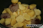 Через 20 минут открываем крышку и переворачиваем котлетки. Добавляем картофель, предварительно порезанный, посоленный. Закрываем крышку и через 10 минут опять открываем и переворачиваем аккуратно картофель.