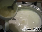 Когда молоко (сливки+вода) приготовились к закипанию - ввела желтки. Помешивая, довела до кипения и прогрела 1 минуту.