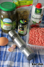 В фарш добавить яйцо, каперсы (или маринованный огурец, порезанный кубиками), кубики консервированных (свежих) помидор без кожицы.