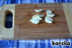 По центру выложить вдоль в ряд оливки и кусочки чеснока (можно использовать другое: кружочки кабачков, помидор, сыр, зелень, творог и пр.)