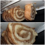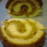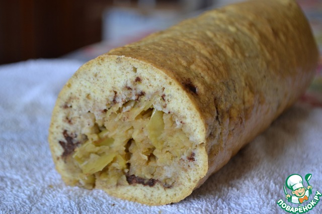 Свернуть в рулет. Здесь меня поджидал "сюрприз": верхний тонкий слой бисквита остался на полотенце.