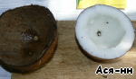 Из кокоса в стакан выливаем жидкость и вскрываем его, как это сделать можно посмотреть например здесь: https://www.povarenok.ru/recipes/show/56491/.