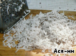 Мякоть кокоса натираем на терке, или если нет желания, то заливаем кусочки кокоса молоком и блендером измельчаем - так быстрей.