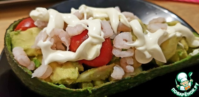 Чашечки из авокадо выстилаем листом салата, сверху выкладываем наш салат и сразу подаeм на стол!!!