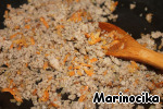 Обжариваем лук (мелко нарезанный) и морковь (натертую на терке) на растительном масле, добавляем фарш, соль и перец.