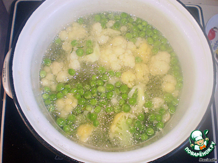 • В кипящей воде отварить капусту и горошек 4 минуты. Не дольше! Под конец варки воду подсолить.