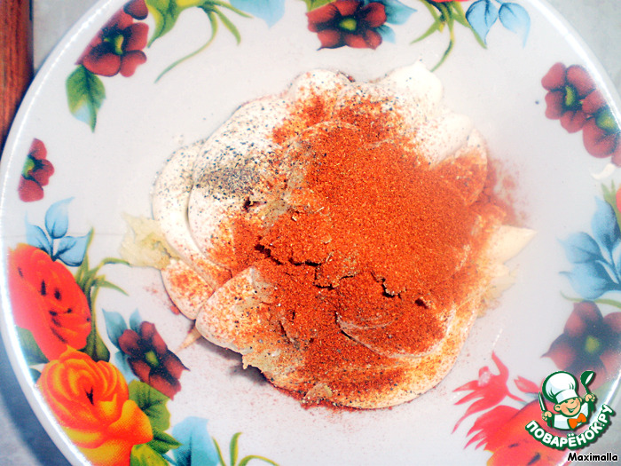 • Он должен обрести розовый оттенок. Если этого не произошло, добавьте еще паприки. И в конце долить ложку воды, перемешать.