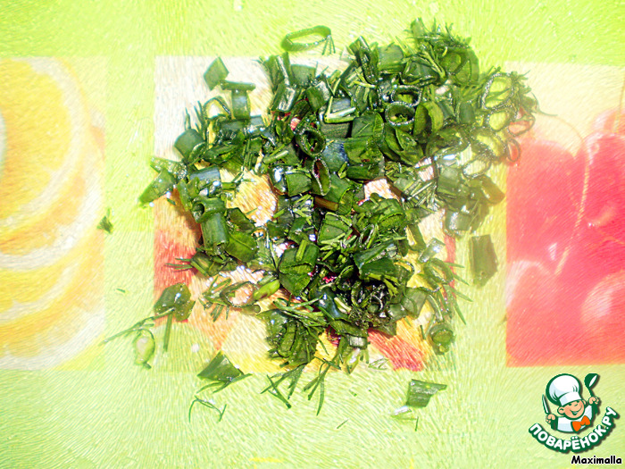 • Добавить зелень и помидор. Аккуратно перемешать.