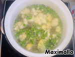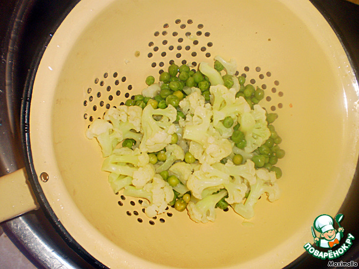 • Горошек промыть. Капусту промыть, разделить на соцветия. Горошек можно и консервированный использовать (тогда его варить не надо!)