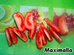 • Помидор вымыть, разрезать на тонкие красивые дольки.