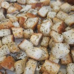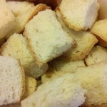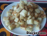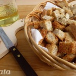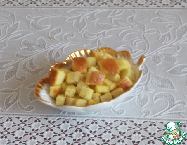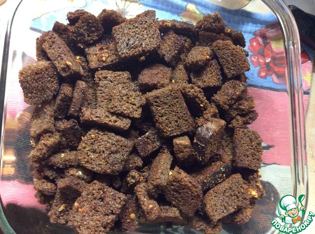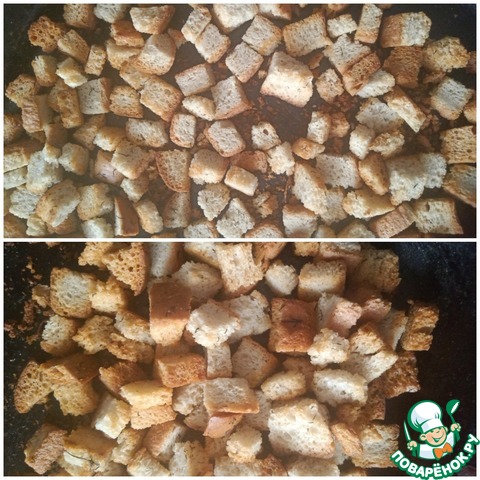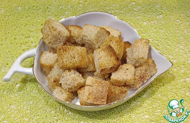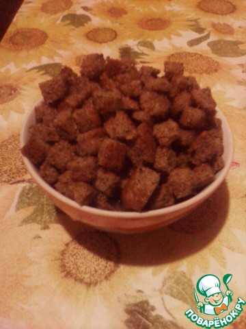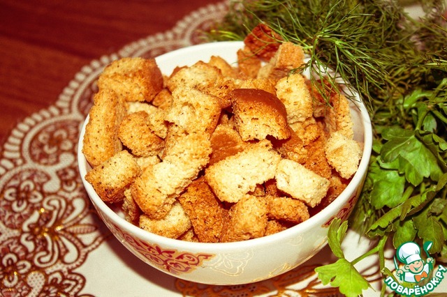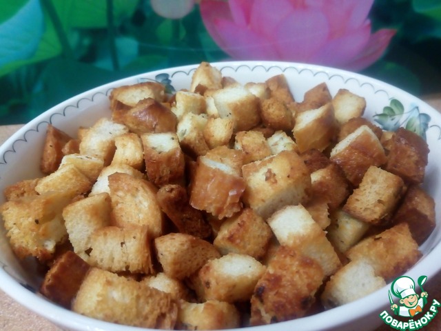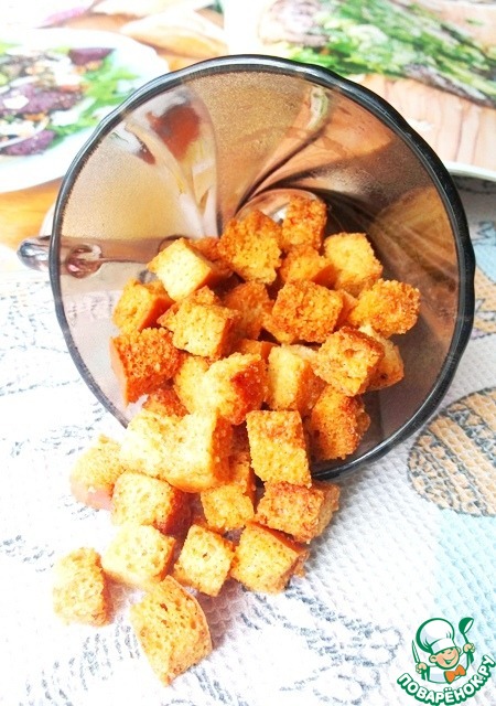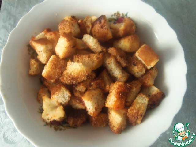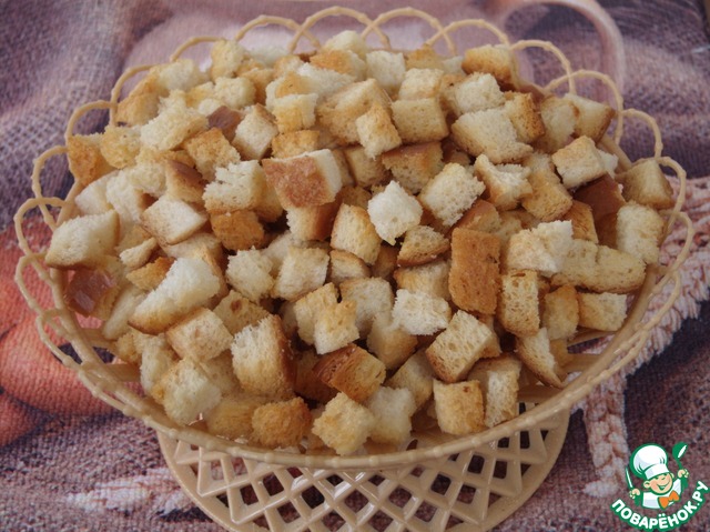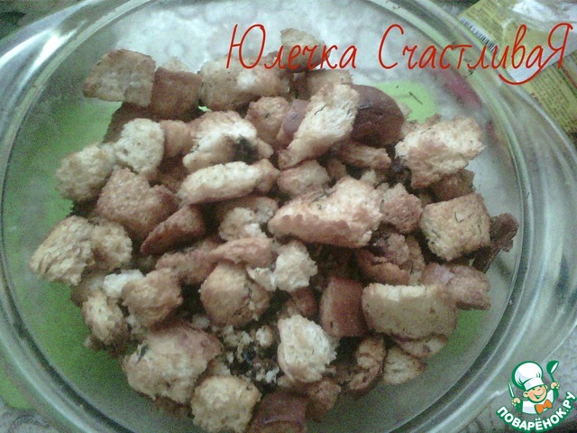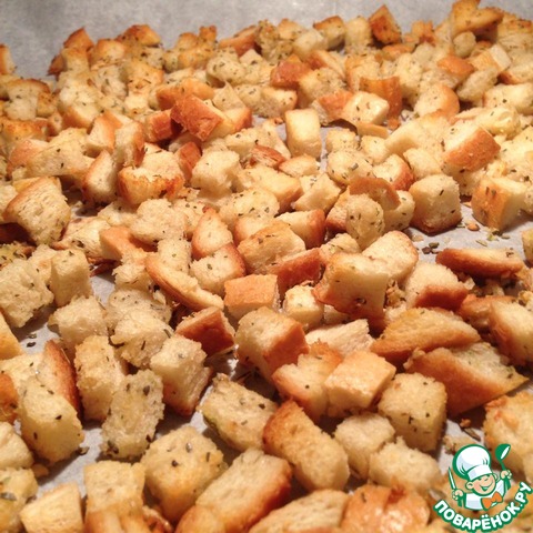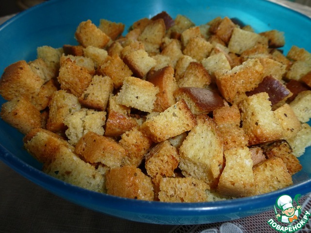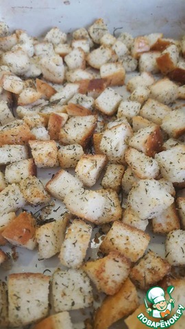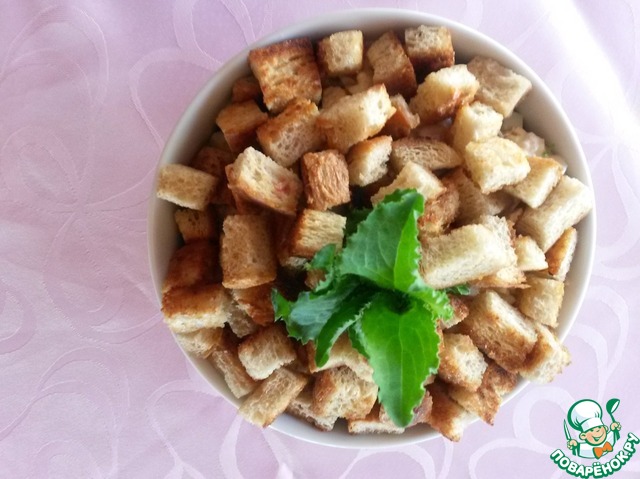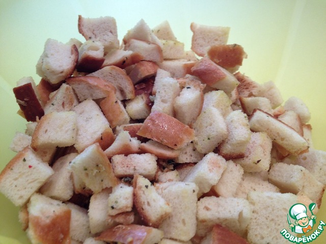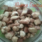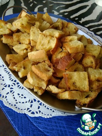 На сайте есть рецепты сухариков, в этом я не оригинальна, но рецепта с таким способом приготовления я не нашла, а способ этот помогает распределить "смазку" равномерно, со всех сторон и на всех кусочках.
