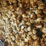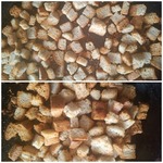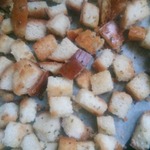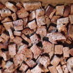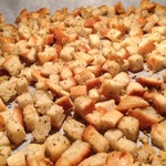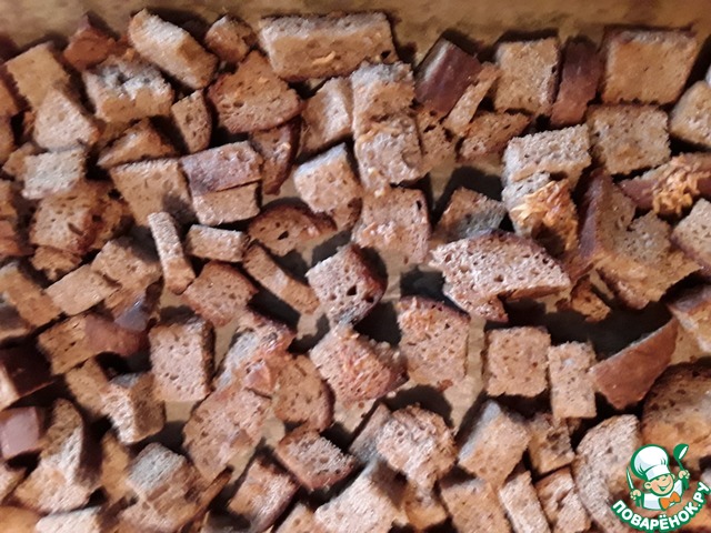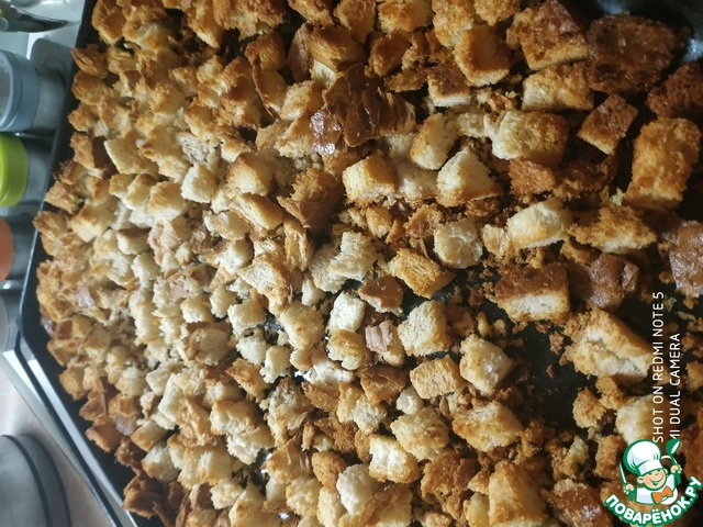 Высыпаем обработанные кусочки на противень, повторяем процедуру с оставшимся хлебом столько раз, сколько частей хлеба у нас есть. Я уложилась в 3 захода. Противень ставим в разогретую до 200 градусов духовку и сушим, иногда перемешивая, чтобы сухарики равномерно зарумянились до нужной нам степени "хрусткости".