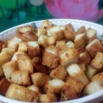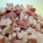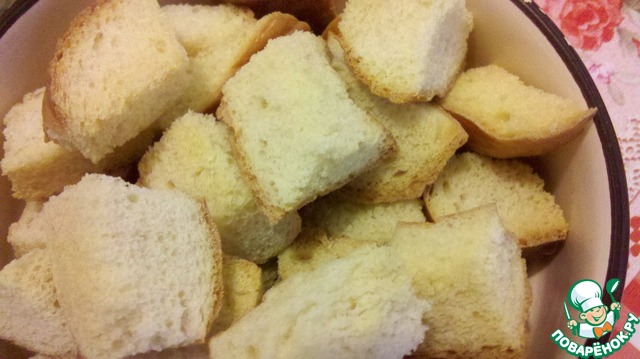 Слегка (а может быть и сильно) зачерствевший хлеб режем на кусочки. Размер - по желанию. У меня зачерствело 2/3 батона, поэтому процесс приготовления я разделила на 3 части. Чем меньше хлеба, тем меньше заходов (в следующих шагах это станет понятнее).
