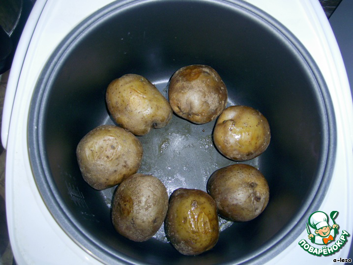 Картофель помыть тщательно, запечь практически до готовности (форму должен держать!).