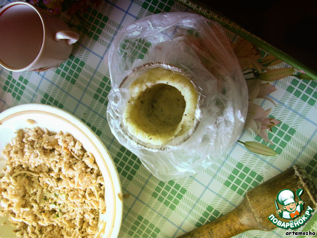 В чашку сначала укладываете картофельную массу и в середине делаете углубление, в которое добавляете слоями сначала сырную массу, а потом натертую колбасу. Затем берете опять картофельную массу и делаете своеобразную крышечку, которая закрывает все слои.