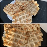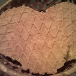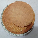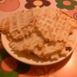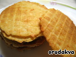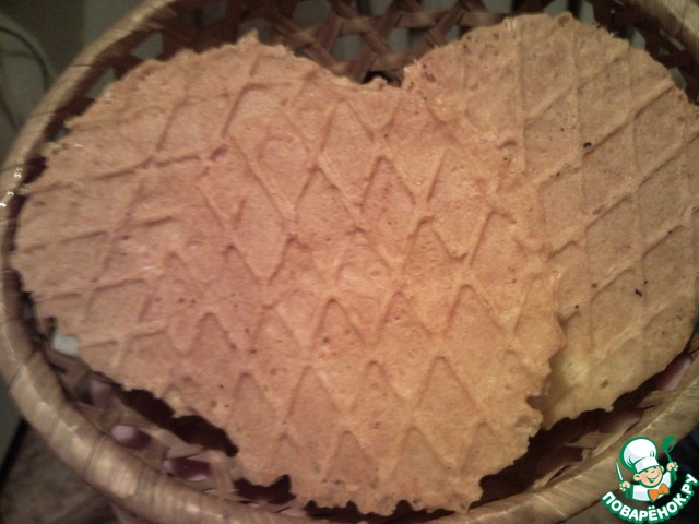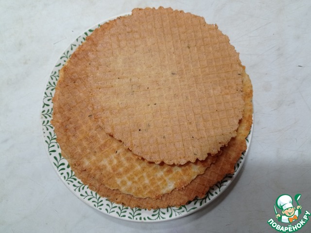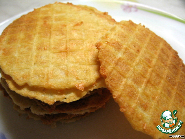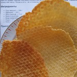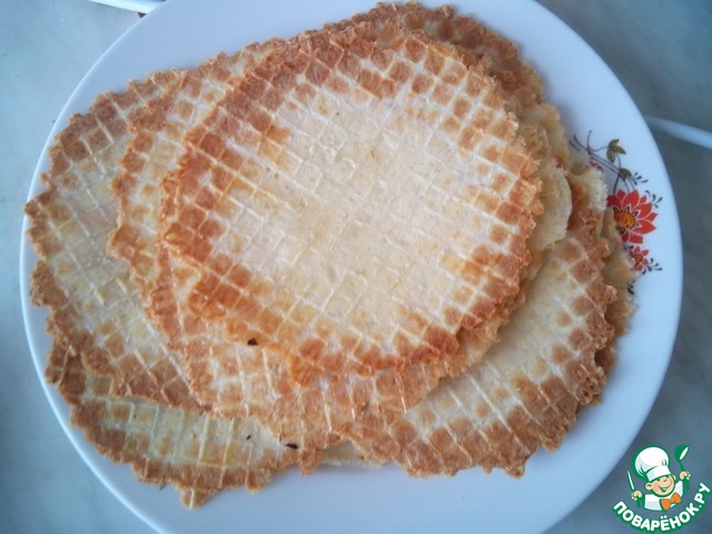 Если выкладывать тесто по 1/2 кофейной ложки и выпекать по 4 шт., то получатся вафельки диаметром приблизительно 5 см.