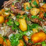 Наконец подошло время открыть казан, добавить немного растёртой зиры и волшебной приправы от любезного продавца пряностей. Не спешите, накройте казан крышкой ещё на минутку, пускай приправы отдадут свой неповторимый аромат. Теперь, выложим Кабоб в большое блюдо, посыплем мелко нарубленной зеленью и позовём всех к столу.