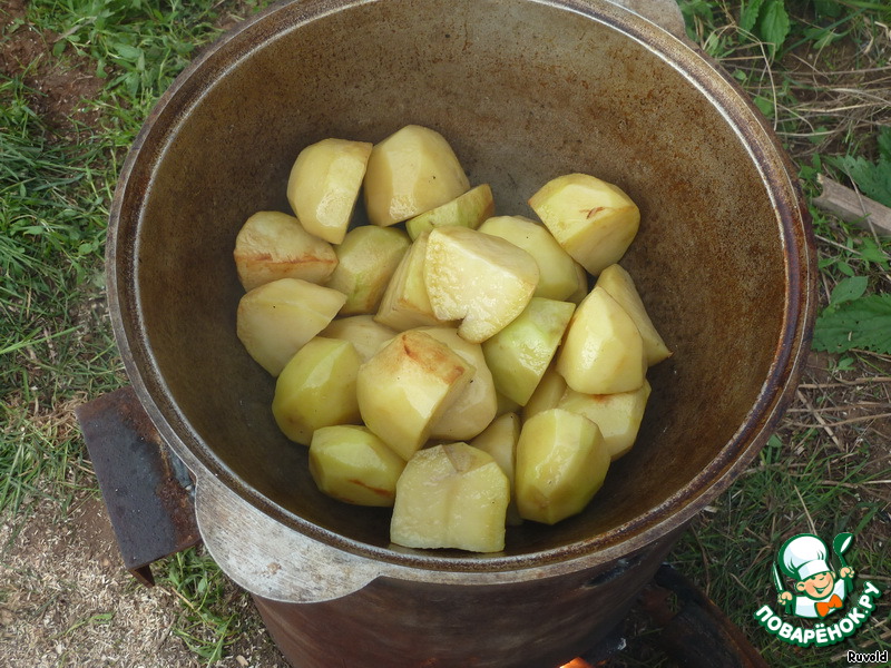 Ну что же, приступим. Разведём в печке сильный огонь, поставим казан, дадим ему прокалиться и закинем нарезанное небольшими кусочками курдючное сало. Из него вытопиться весь жир и останутся замечательные, хрустящие шкварочки, которые можно выложить на тарелку, присыпать солью и подать как закуску к холодной, запотевшей водочке или пенному пиву. А мы пока нарежем картофель: крупные клубни на четыре части, средние - на две, небольшие оставим целёхонькими и отправим наши «земляные яблоки» в казан. Пусть они обжарятся до красивой золотистой корочки, которая сохранит все питательные и полезные вещества.
