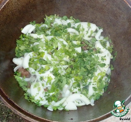 Нарежем полукольцами несколько луковиц, мелко порубим небольшой пучок кинзы и выложим ровным слоем на наше мясо. Потом луковое покрывало даст сок и не позволит испаряться лишней влаге, а кинза отдаст свой непревзойдённый аромат.