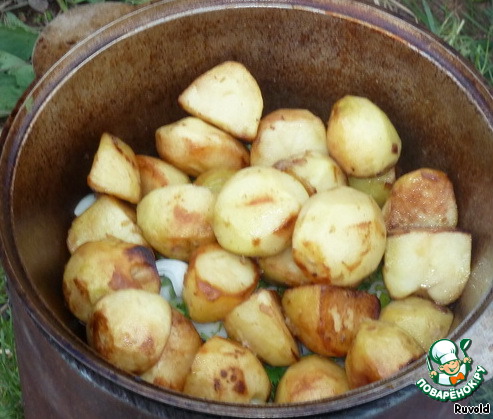 А теперь и последний ингредиент, румяная картошка. Аккуратно выложим её на луковую подушку, пусть она готовится на насыщенном мясном пару, пропитывается запахами приправ, но в то же время сохраняет свой особенный вкус. Самое время досолить, накрыть крышкой и отойти от казана на час. Нет, нет не надо добавлять никакой воды, её достаточно в мясе и в луке. Ну может быть полстаканчика, если у вас маловато мяса. Наше блюдо не будет жариться на большом огне, а будет томиться на углях. Мы только изредка будем добавлять небольшой кусочек полешка для пополнения запаса углей.