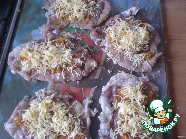 На отбитые кусочки мяса (которые в себя впитали и рассол, и все остальное, отходов не было) положила по 1 чайной ложке моркови с луком, -