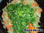 В разогретом растительном масле обжариваем лук, морковку, перец (минуты 3-4). После, добавляем измельченный чеснок и обжариваем еще около минуты.