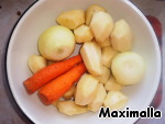 В глубокую сковороду налить кипяток, выложить картофель, лук и морковь, посолить, добавить все специи, накрыть крышкой и тушить 15 минут без рыбы.
