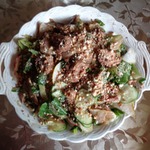 На тарелки выкладываем салат, затем курицу и посыпаем орешками.