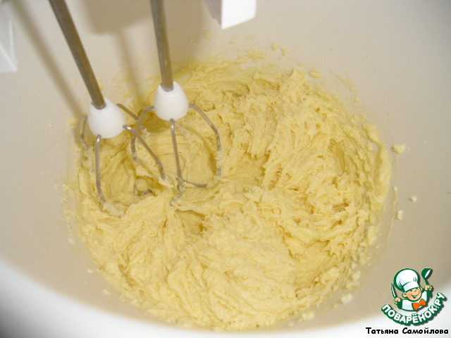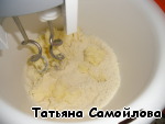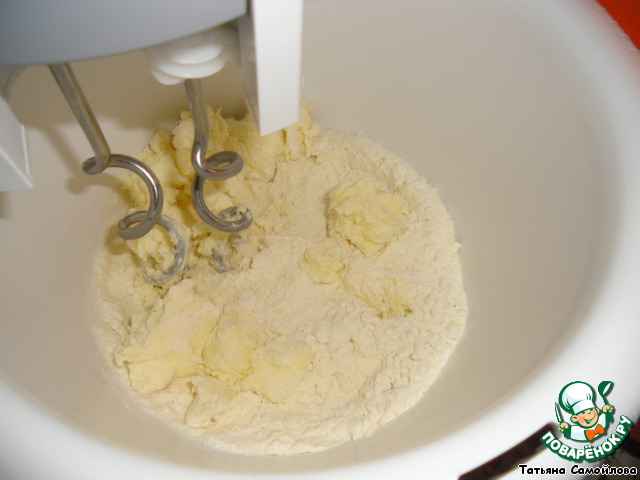Готовим тесто: масло нарезаем кусочками, добавляем муку, сахар - взбиваем миксером, используя насадки для теста.