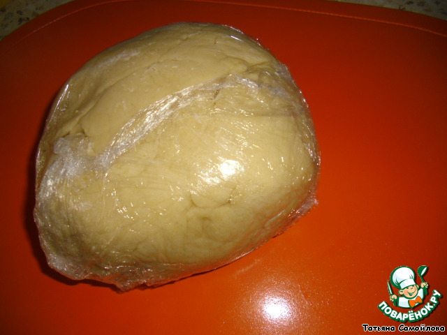 Из теста формируем шар, заворачиваем в пищевую пленку и убираем в холодильник на 1 час.