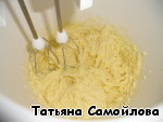 Готовим начинку: взбиваем миксером масло с сахаром. Добавляем яйцо и желток, перемешиваем. Добавляем муку и еще перемешиваем.