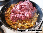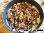 Грибы потушим хорошо и уже после добавляем нарезанную печень.