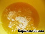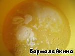 Растопите масло и добавьте к нему 3 яйца, соль и разрыхлитель и хорошенько все размешайте. -